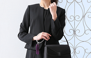略喪服とは、ブラックのスーツやワンピース、パンツスタイルを指します。黒であれば良しとされ、通夜や弔問、法事法要など、格式張らない場で着用します。
