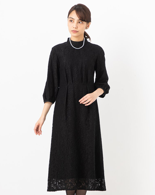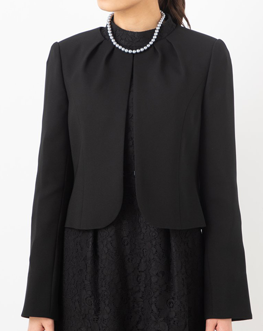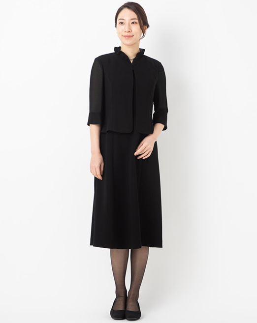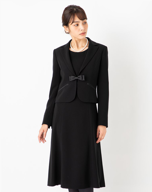正喪服とは、弔事用の染めが施され、シルクやウールなどの高級素材を使用し、露出と装飾が控えめな黒いワンピーススーツを指します。もっとも高い格式となり、遺族や近い親族が着用する喪服です。