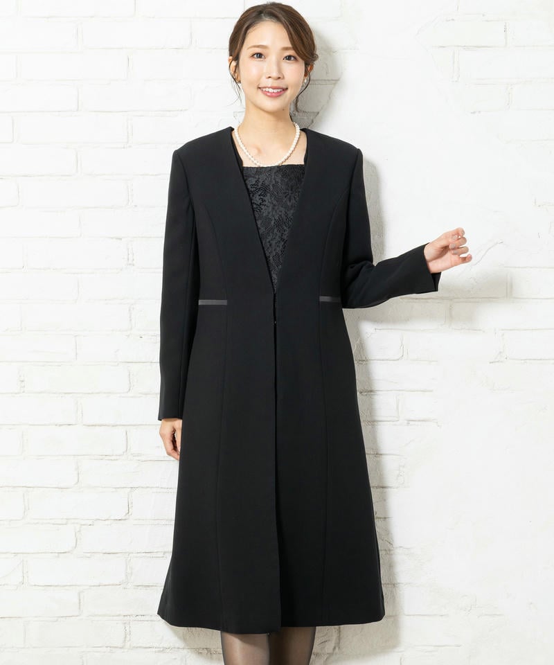 ロングコートを羽織ったかのような、現代的なデザインのブラックフォーマルアンサンブル。慶弔両用で着用いただける一着です。