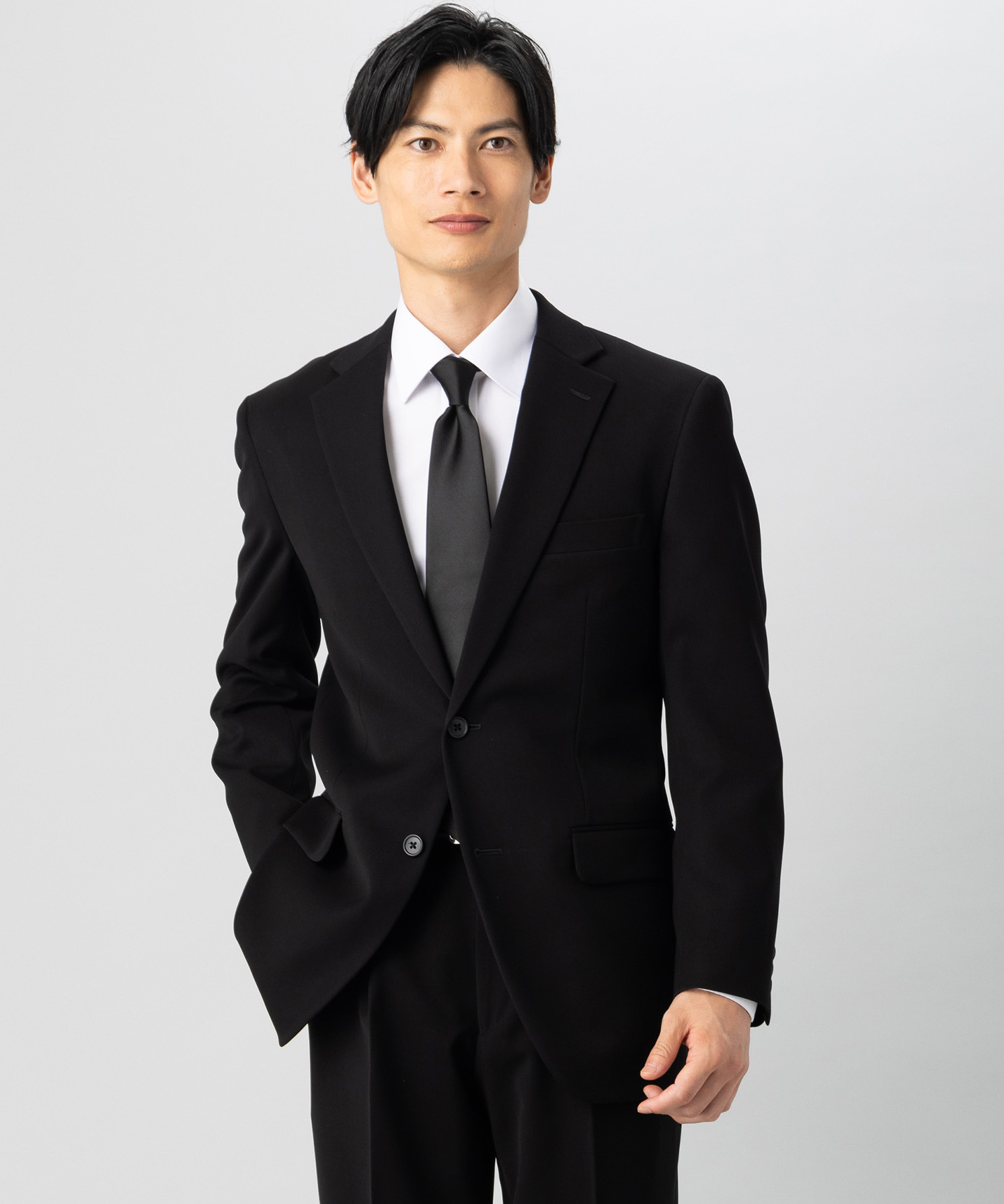 濃染加工を施したLUNA ・BLACK生地のフォーマルスーツです。ポリエステル100%とは思えないほどキメが細かく、ボディに馴染じむしなやかさが特徴。ジャケットは細身すぎないレギュラーフィット、スラックスはワンタックで緊張感のある場や長時間の着席でも窮屈感を軽減してくれます。光の反射が少ない「漆黒」生地を使用していますので、準喪服として親族の方から一般弔問の方まで、全ての弔事シーンで着用いただけます。
