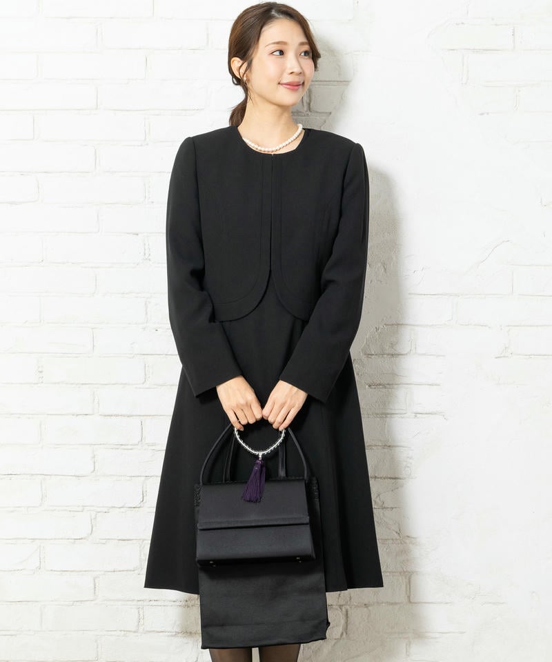 『二重織』を使用した、オールシーズン着用可能なブラックフォーマルアンサンブルです。コンパクトに作られたノーカラージャケットは、縁にパイピングが施されたシンプルなデザイン。