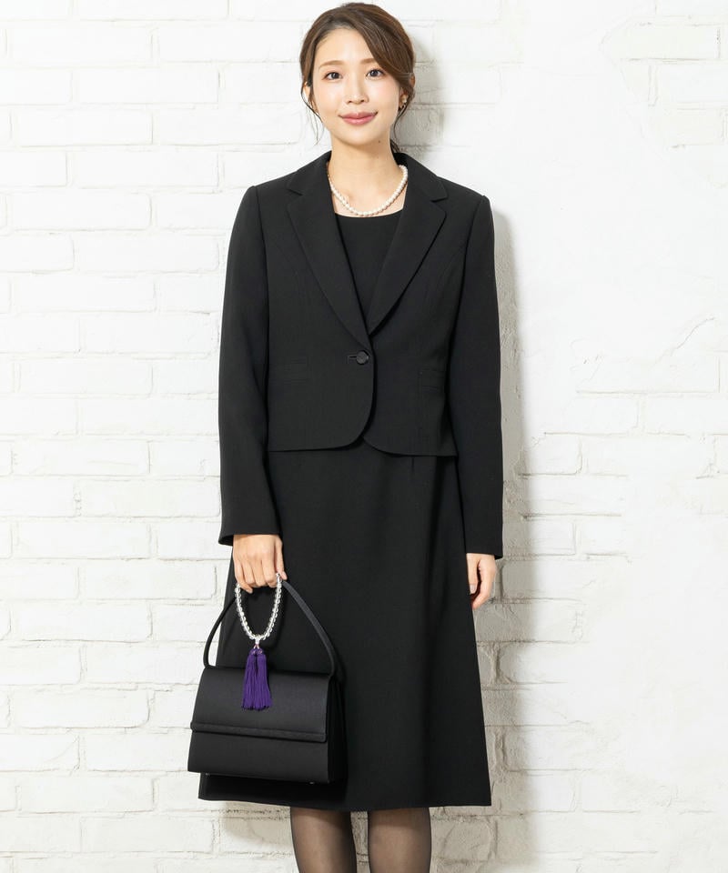 シンプルなテーラードジャケットに、広がりを抑えたセミフレアーのワンピースを合わせたベーシックなブラックフォーマルスタイルです。