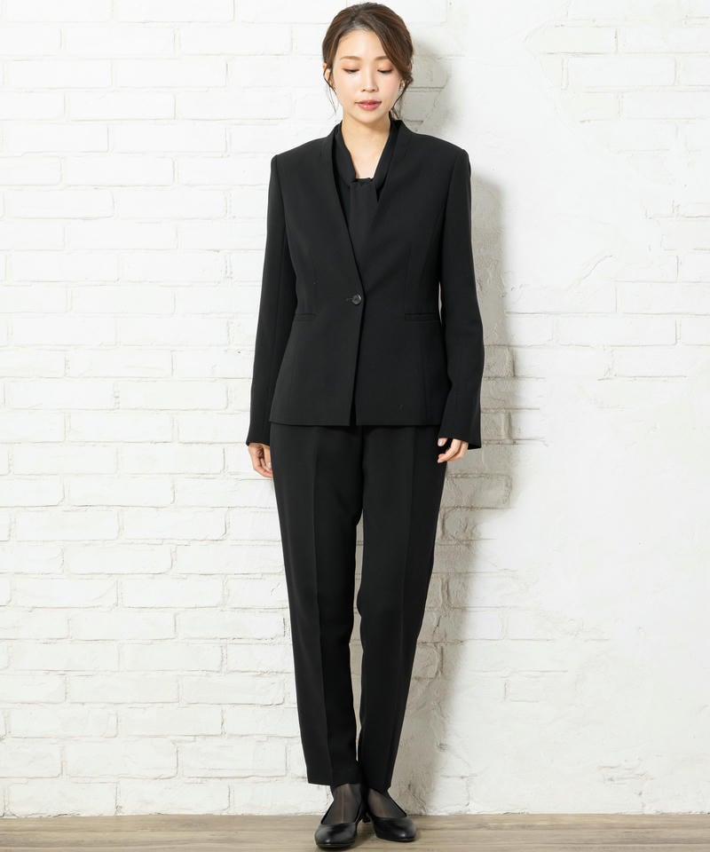 近年人気のパンツブラックフォーマルです。ブラウスのリボンは取り外しが可能な2WAY仕様。